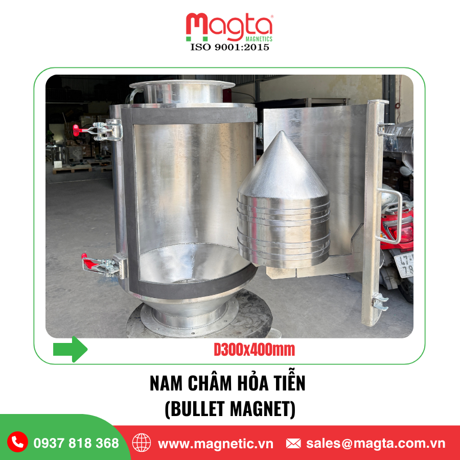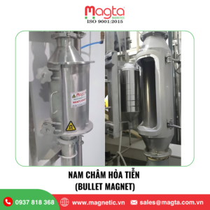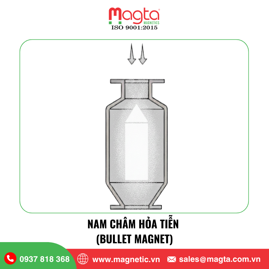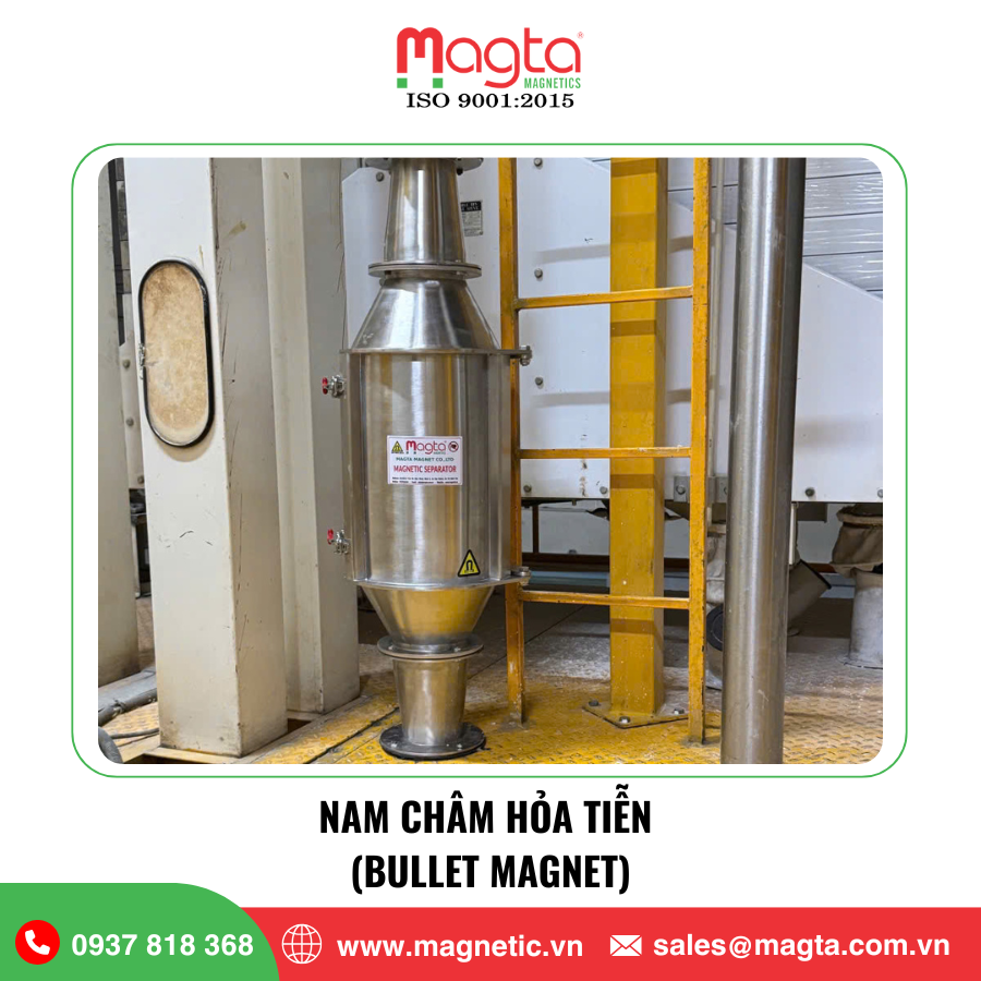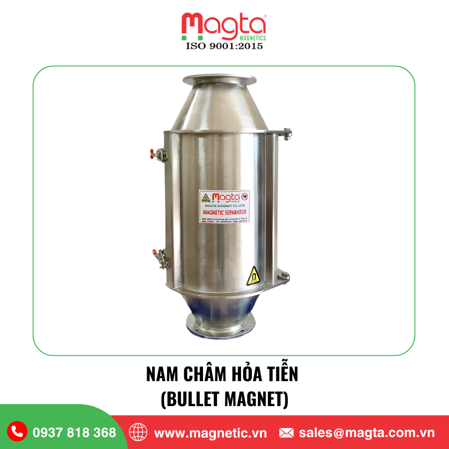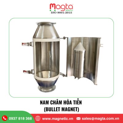 - Nam châm hỏa tiễn (Bullet Magnet) là thiết bị tách sắt được sử dụng trong các hệ thống cấp liệu rơi tự do, nơi nguyên liệu di chuyển theo phương thẳng đứng như phễu, silo, ống dẫn. Thiết bị có lõi nam châm dạng hình nón (hỏa tiễn) đặt ở trung tâm thân ống, giúp bẻ dòng nguyên liệu và tăng hiệu quả lọc sắt.