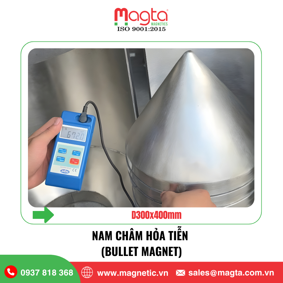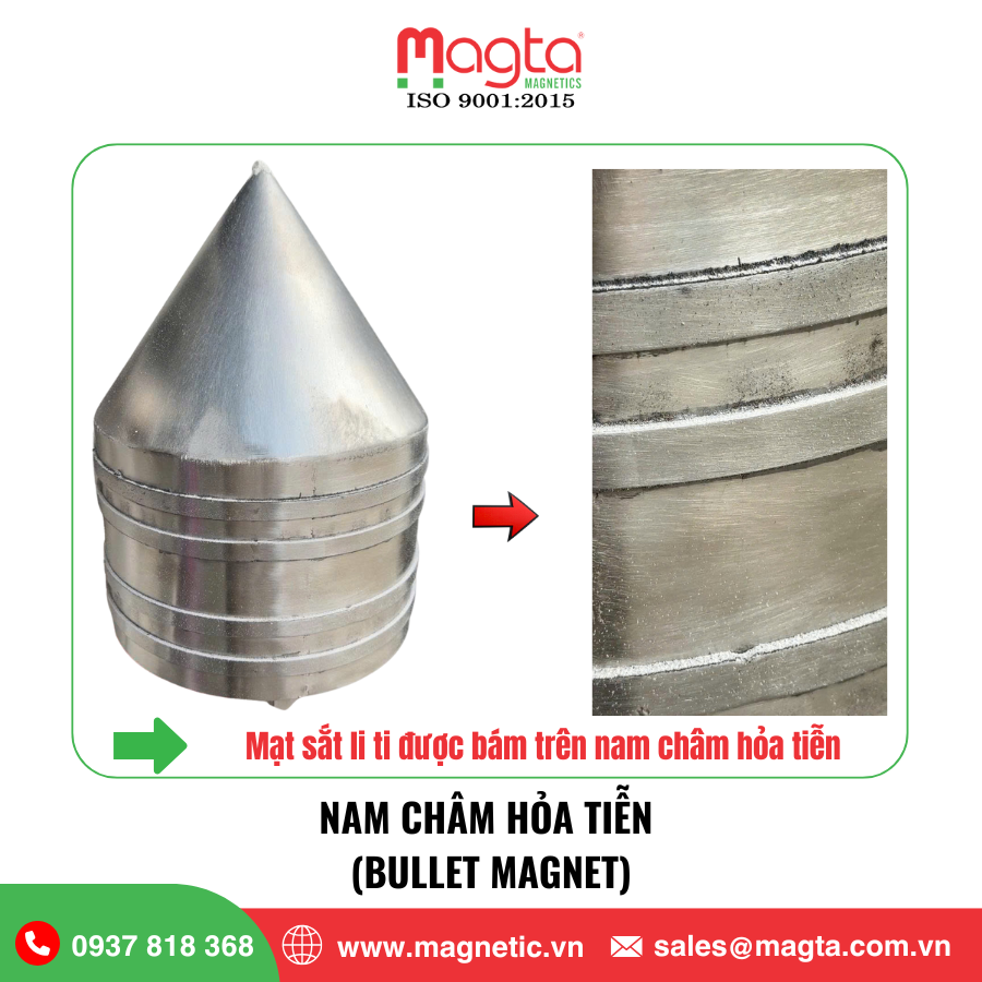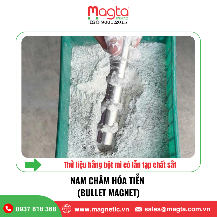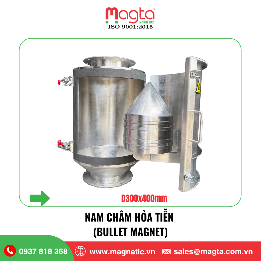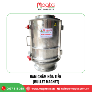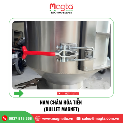 - Nam châm hỏa tiễn (Bullet Magnet) là thiết bị tách sắt được sử dụng trong các hệ thống cấp liệu rơi tự do, nơi nguyên liệu di chuyển theo phương thẳng đứng như phễu, silo, ống dẫn. Thiết bị có lõi nam châm dạng hình nón (hỏa tiễn) đặt ở trung tâm thân ống, giúp bẻ dòng nguyên liệu và tăng hiệu quả lọc sắt.