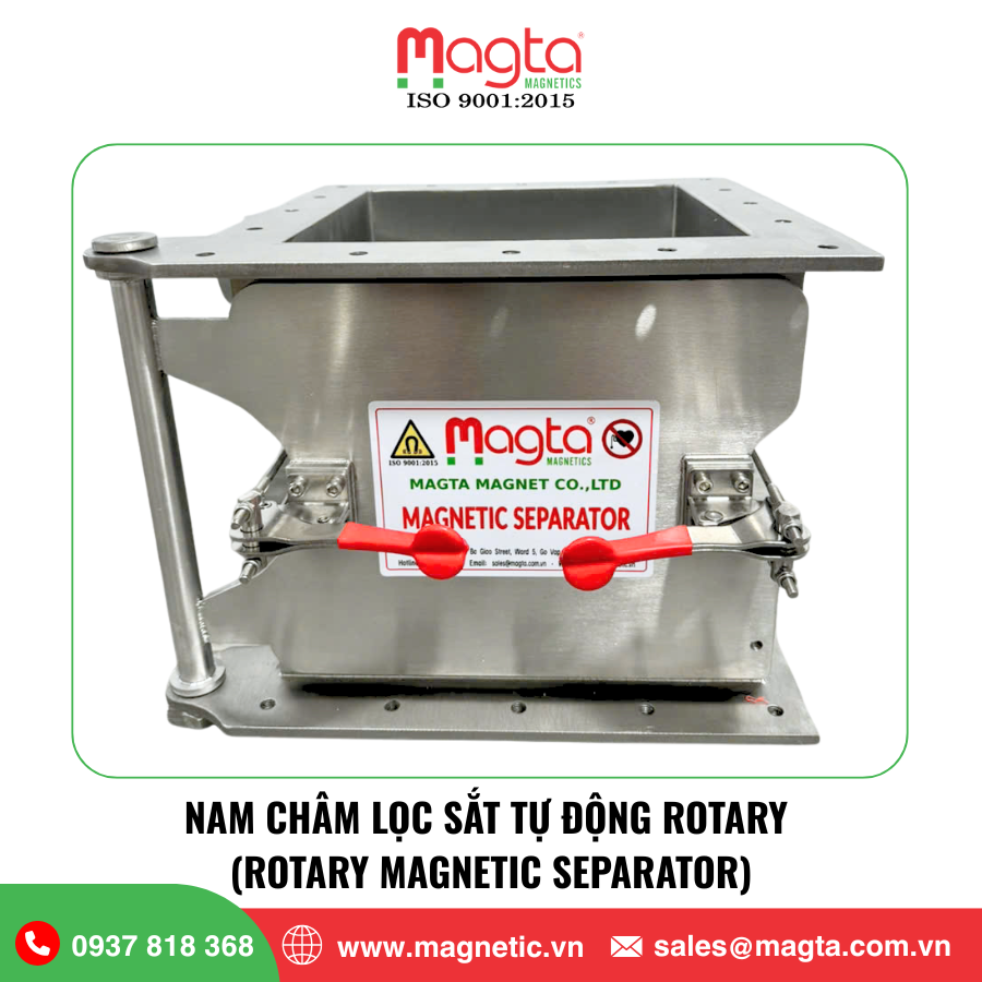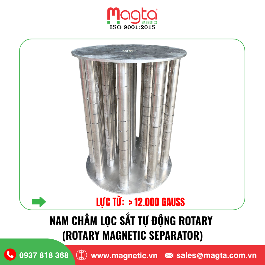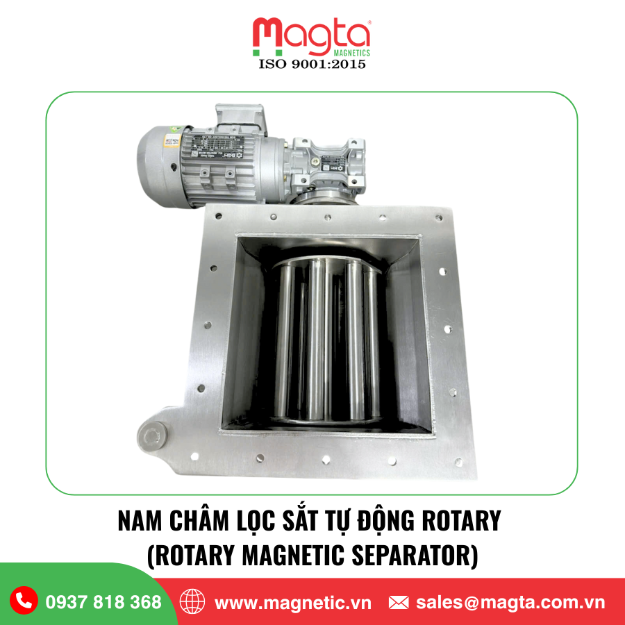 - Nam châm lọc sắt tự động Rotary là thiết bị dùng hệ thống nhiều thanh nam châm quay bên trong buồng lọc để tách kim loại sắt khỏi nguyên liệu dạng bột hoặc hạt. Nhờ chuyển động quay liên tục, thiết bị giúp tăng diện tích tiếp xúc với từ trường và nâng cao hiệu quả lọc sắt trong các dây chuyền sản xuất công nghiệp.