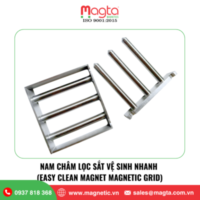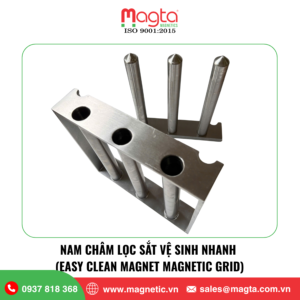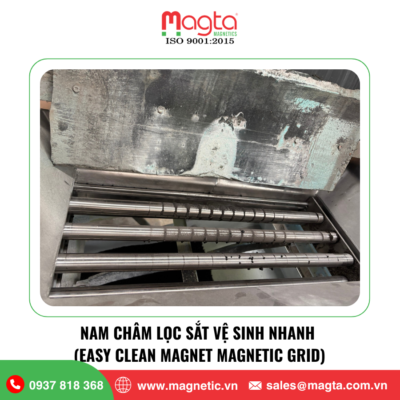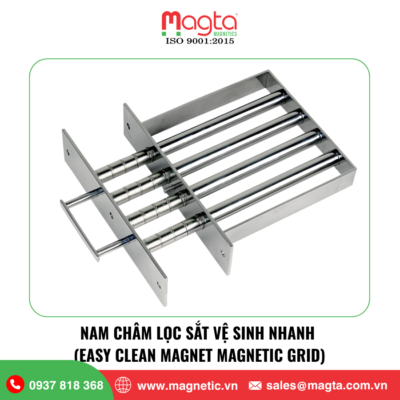 Nam châm lọc sắt vệ sinh nhanh (Easy Clean Magnet) là thiết bị lọc sắt được sử dụng trong các dây chuyền xử lý nguyên liệu dạng bột hoặc hạt, nơi yêu cầu vệ sinh thường xuyên và hạn chế tối đa thời gian dừng máy. Thiết bị được thiết kế với cơ cấu vệ sinh nhanh, cho phép người vận hành kéo lõi nam châm ra ngoài để loại bỏ tạp chất kim loại một cách nhanh chóng.